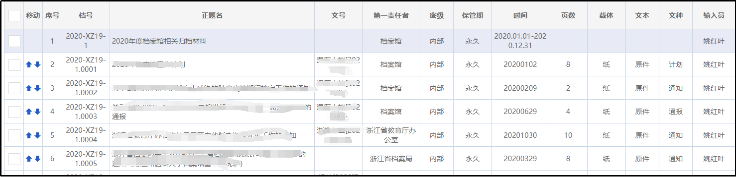 案卷级和文件级的著录差不多,不同的是在“时间”这一栏里,由时间变成了起止时间。起止时间是指本盒档案最早的文件时间和最晚的文件时间。新系统起止时间录入的框只有一个,老系统录入格式是2022.05.01-2022.05.30,现在全部直接八位数表示,无须加点,变成20220501-20220530格式。另一个不同在于案卷级的录入界面里多了接收人、移交时间、移交人这几项。移交时间是指各个部门材料交上来的时间。移交人填部门档案员的名字。接收人是档案馆负责接收档案的人员。