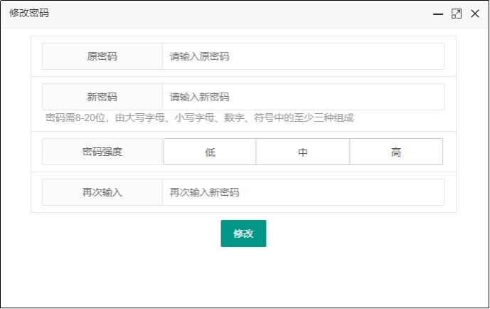 首先点击右上角的“登录名”,“修改密码”选项,进入“修改密码”选框,按提示输入原密码、新密码、确认新密码后点击修改即可。如下图所示: