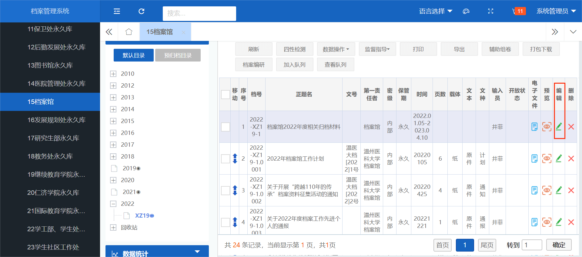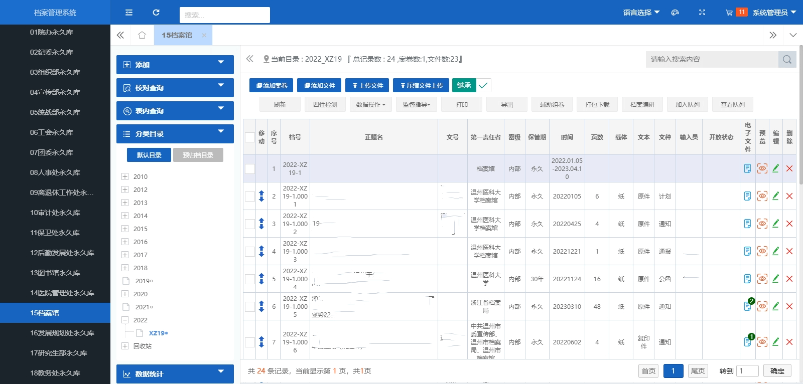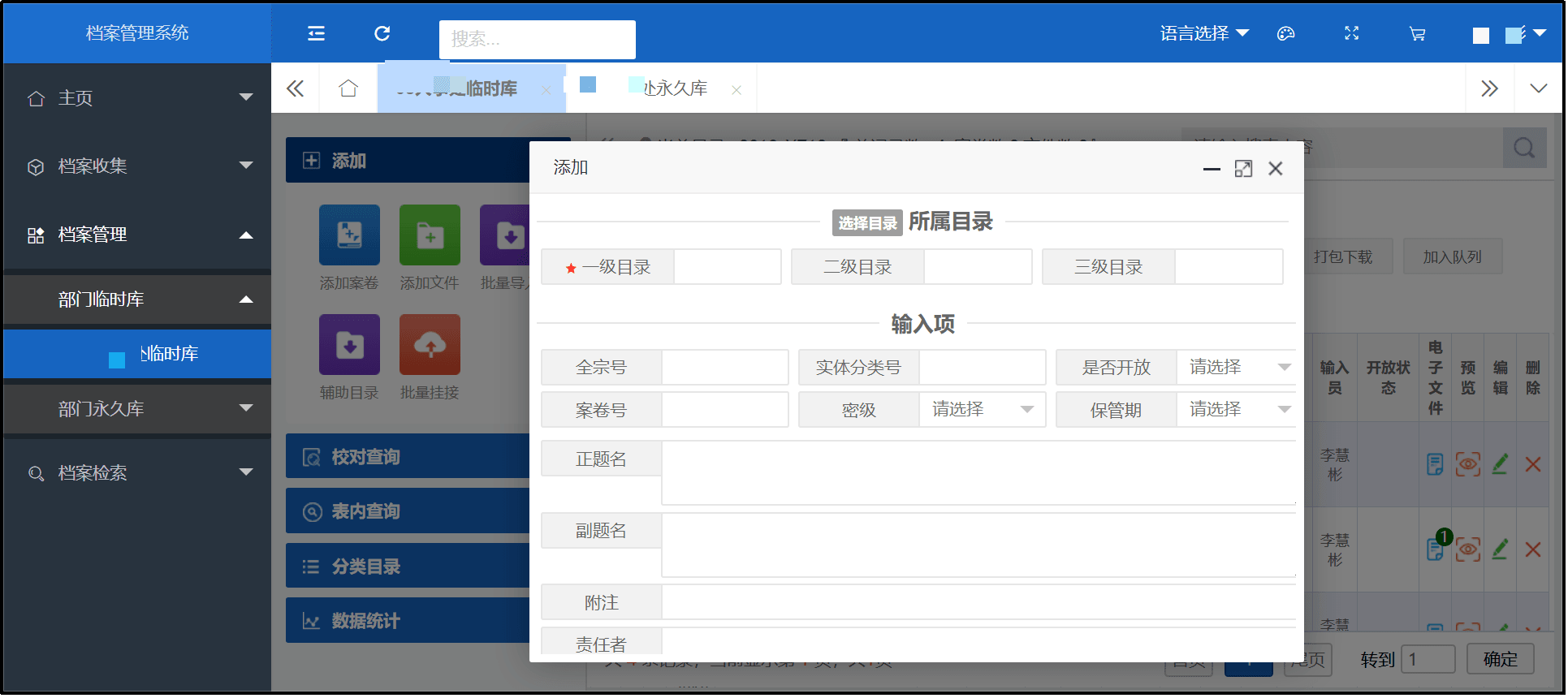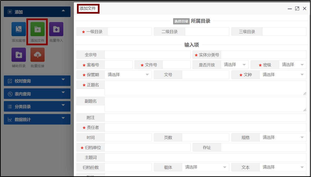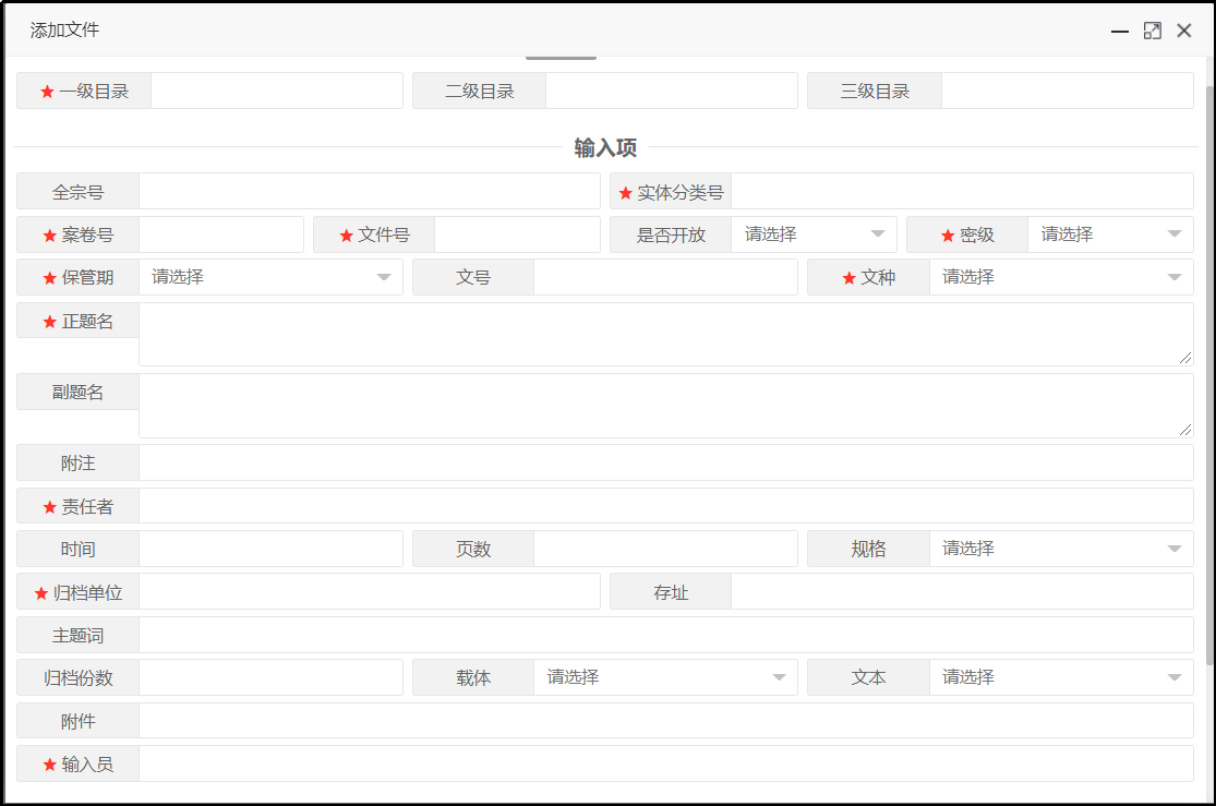 所属目录:用户添加目录名称,最多三级目录。一级目录一般为年度,二级目录一般为实体分类号(例如XZ11,JX11等)。