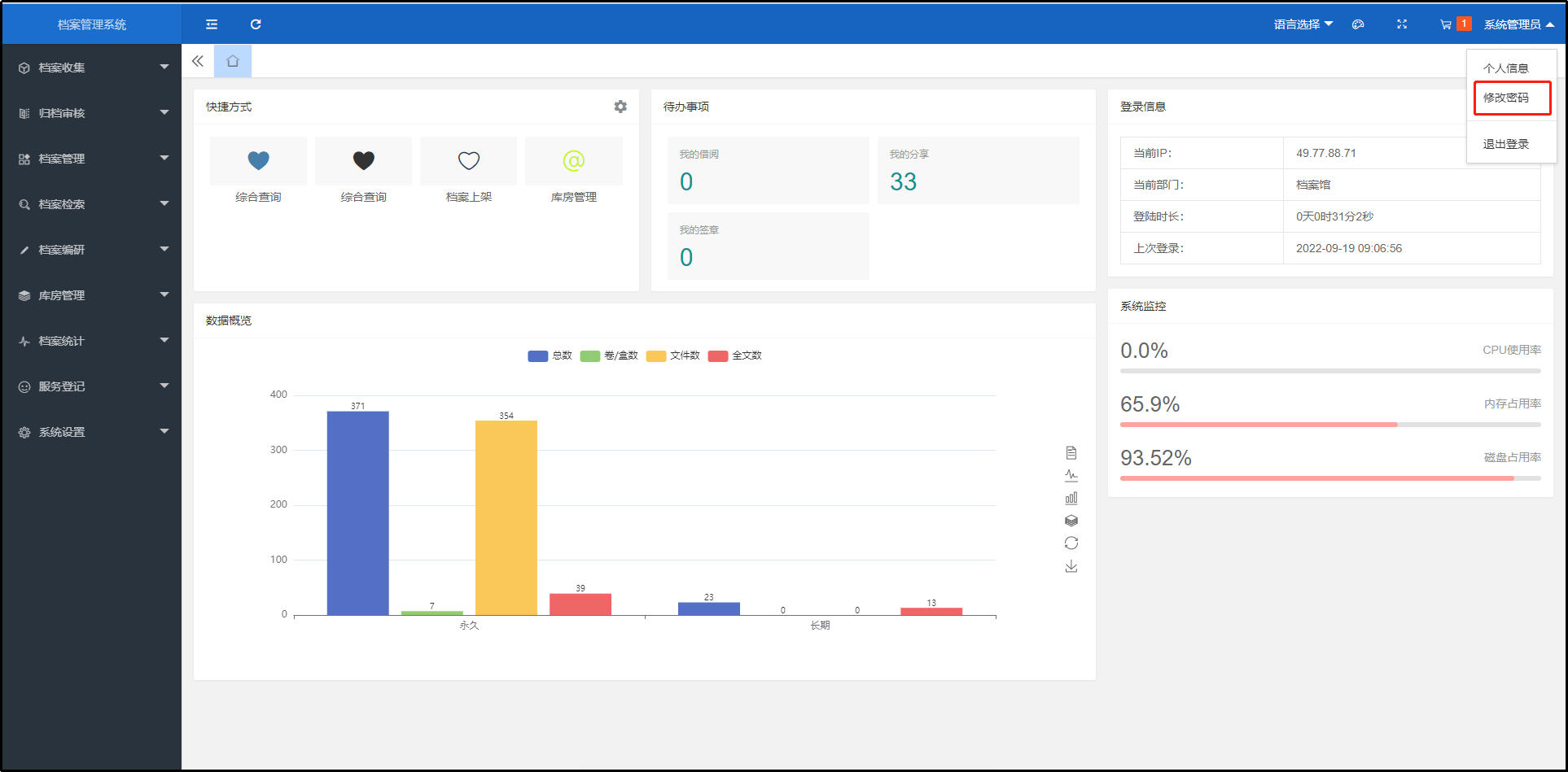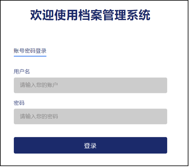 打开浏览器输入档案管理系统网址http://172.18.237.237/index即可进入系统,网页右边档案管理系统登录处输入用户名和密码,点登录按钮即可进入本部门的临时库和永久库。如下图所示: