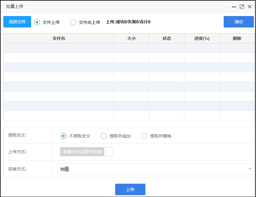 挂接方式:选择挂接的方式,若用户上传的文件的挂接内容与已有的文件一样,上传的文件会自动进行相对应的文件的附件中,若没有,系统会自动创建目录存放文件。