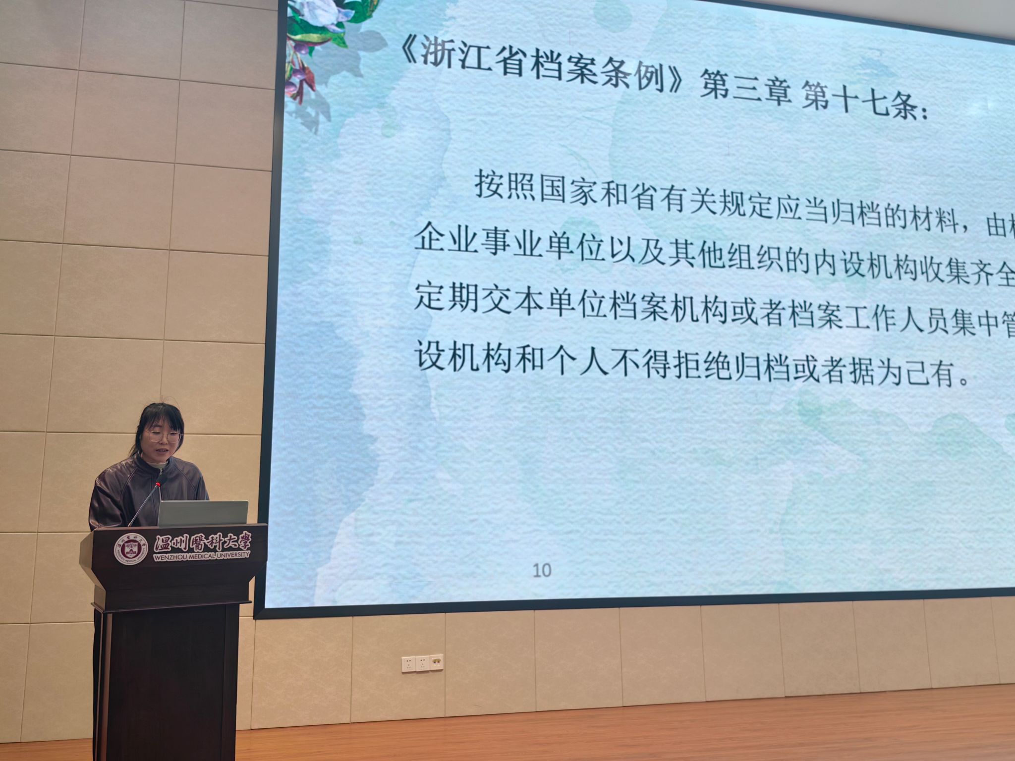 我校档案工作稳步推进、成效显著,离不开部门档案员们的履职尽责、务实笃行,为进一步激发全体部门档案员的工作热情和责任感,档案馆授予叶辉辉等9名同志优秀部门档案员称号,并为其颁发证书。获奖同志代表夏淑敏上台发言,分享了档案收集整理工作中的经验做法,建议各位档案员加强交流、相互借鉴,不断提高服务意识和规范意识。